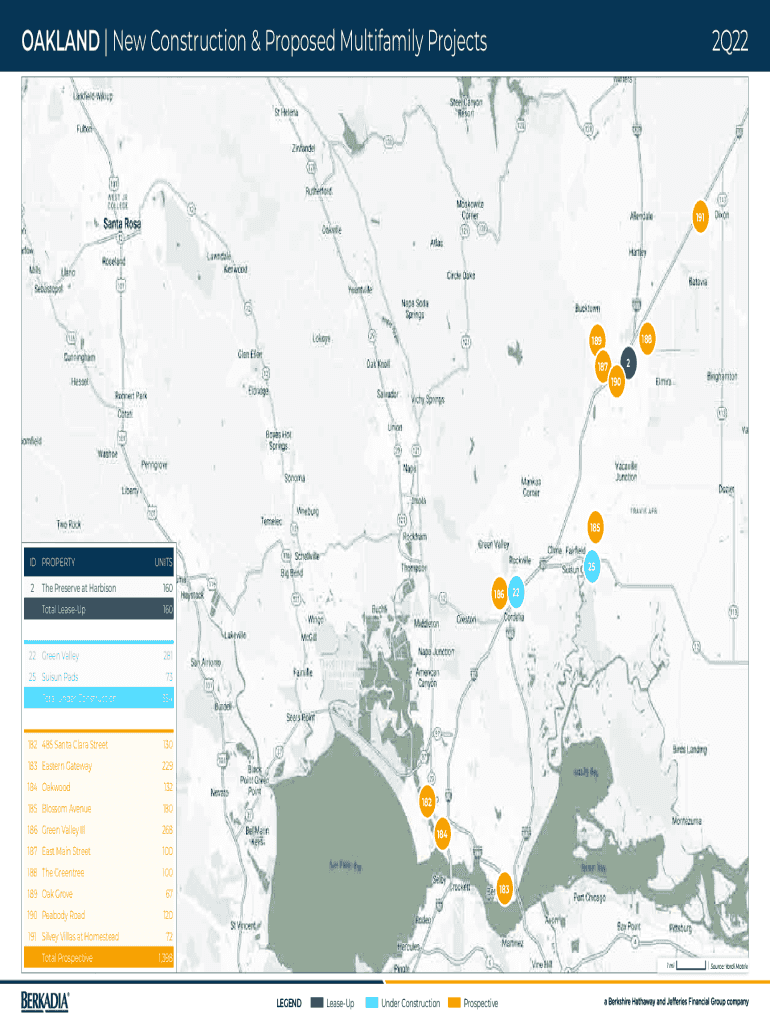 OAKLAND | New Construction & Proposed Multifamily Projects2Q22191188189 1872 190185 IDPROPERTYUNITS2The Preserve at Harbison160Total LeaseUp16022 Green Valley28125 Sui sun Pads73Total Under Construction130183