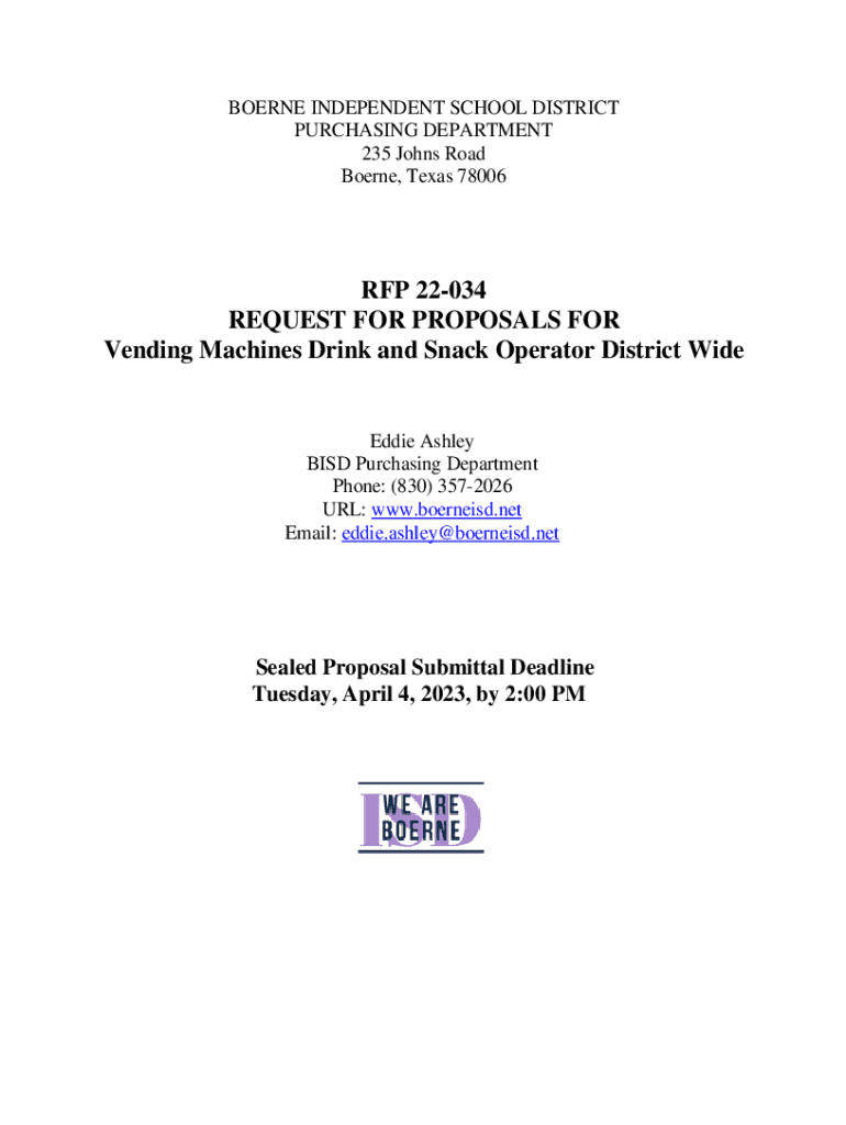 BORNE INDEPENDENT SCHOOL DISTRICT PURCHASING DEPARTMENT 235 Johns Road Borne, Texas 78006RFP 22034 REQUEST FOR PROPOSALS FOR Vending Machines Drink and Snack Operator District Wide Eddie Ashley BIRD