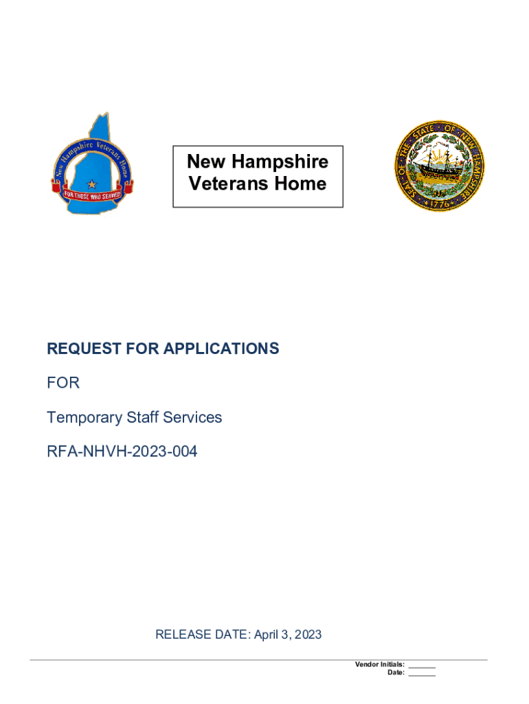 New Hampshire Veterans HomeREQUEST FOR APPLICATIONS FOR Temporary Staff Services RFANHVH2023004RELEASE DATE: April 3, 2023, Vendor Initials: ___ Date: ___TABLE OF CONTENTS 1.PURPOSE AND OVERVIEW32.STATEMENT