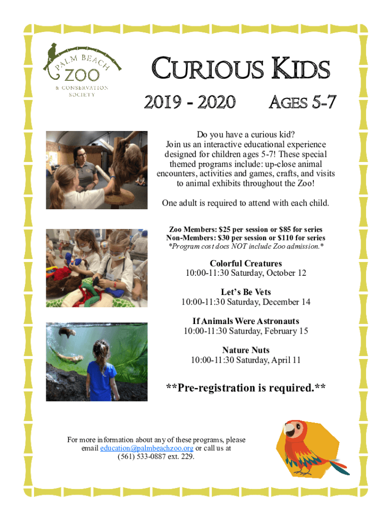 CURIOUS KIDS 2019 2020AGES 57Do you have a curious kid? Join us an interactive educational experience designed for children ages 57! These special themed programs include: up close animal encounters,