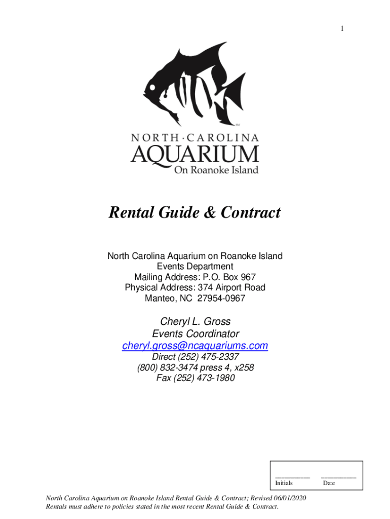 1Rental Guide & Contract North Carolina Aquarium on Roanoke Island Events Department Mailing Address: P.O. Box 967 Physical Address: 374 Airport Road Mantel, NC 279540967Cheryl L. Gross Events Coordinator