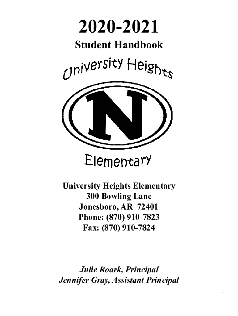 20202021 Student HandbookUniversity Heights Elementary 300 Bowling Lane Jonesboro, AR 72401 Phone: (870) 9107823 Fax: (870) 9107824Julie Roar, Principal Jennifer Gray, Assistant Principal 1UNIVERSITY