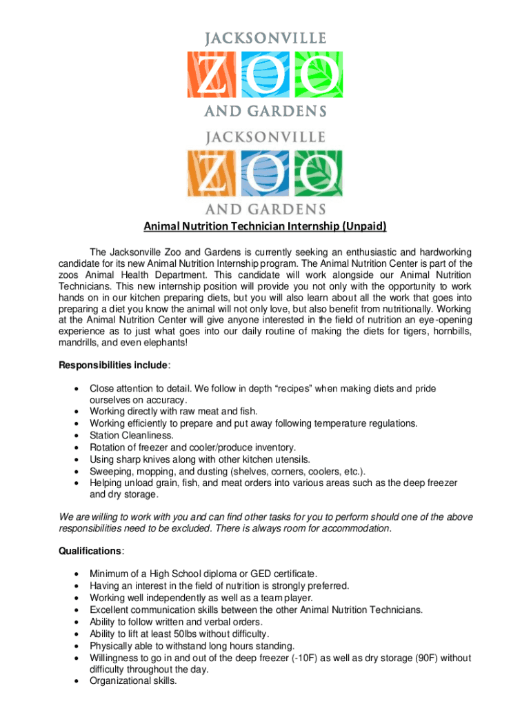 Animal Nutrition Technician Internship (Unpaid) The Jacksonville Zoo and Gardens is currently seeking an enthusiastic and hardworking candidate for its new Animal Nutrition Internship program. The