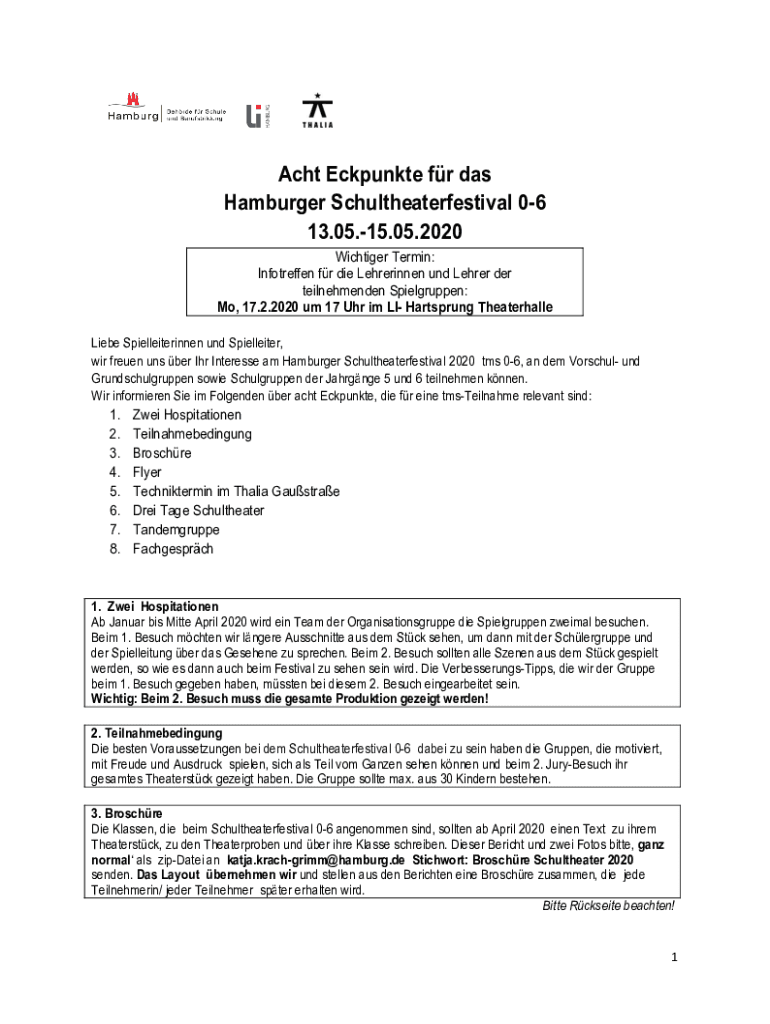 Act Eckpunkte for was Hamburger Schultheaterfestival 06 13.05.15.05.2020 Richter Termini: Infotreffen for die Lehrerinnen UND Leader her teilnehmenden Spielgruppen: Mo, 17.2.2020 um 17 Uh rim LI Hart