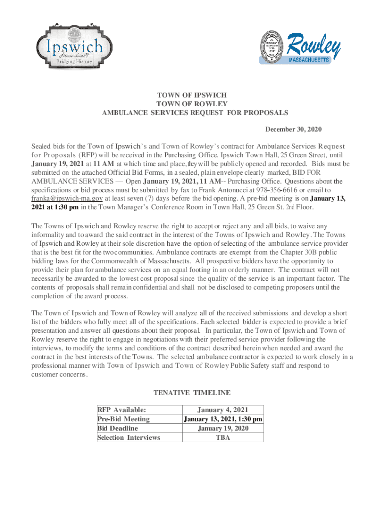 TOWN OF IPSWICH TOWN OF ROWLEY AMBULANCE SERVICES REQUEST FOR PROPOSALS December 30, 2020Sealed bids for the Town of Ipswich's and Town of Rowley contract for Ambulance Services Request for Proposals
