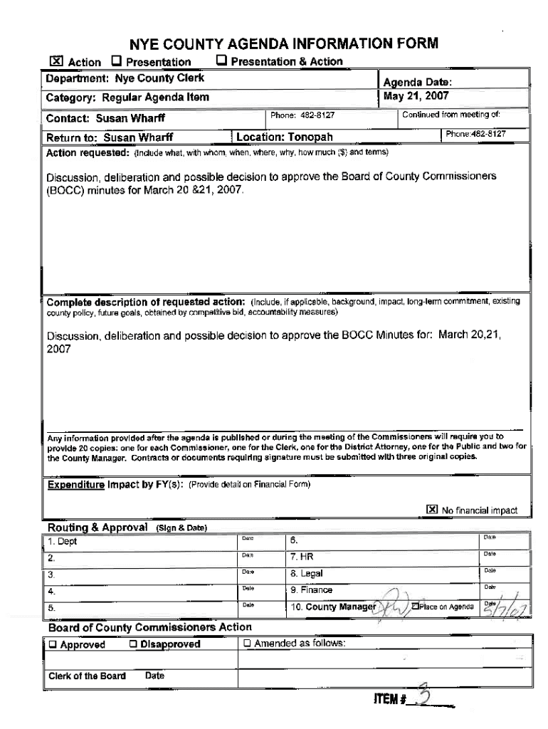 NYE COUNTY AGENDA INFORMATION FORM Action Presentation Department: Nye County ClerkPresentation & Action I, Category: Regular Agenda Item Contact: Susan Wharf Phone: 4828127I Agenda Date: 1 May 21,