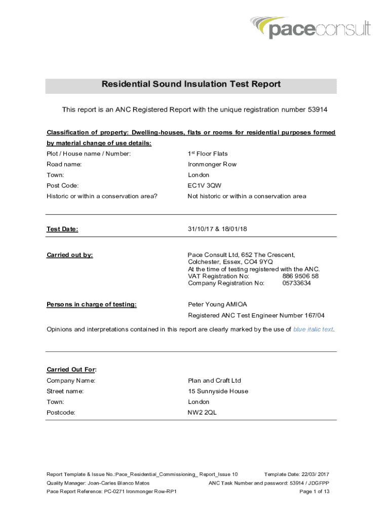 Residential Sound Insulation Test Report This report is an ANC Registered Report with the unique registration number 53914 Classification of property: Dwelling houses, flats or rooms for residential