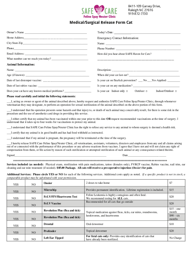 8411109 Garvey Drive, Raleigh NC 27616 9198727730Medical/Surgical Release Form Cat Owners Name ___Today's Date: ___Home Address___Emergency Contact Information:City State Zip___Name: ___Phone___Phone