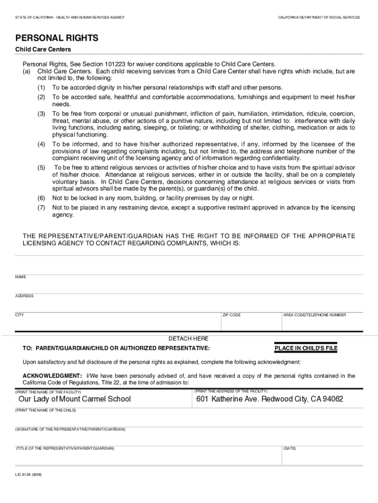 STATE OF CALIFORNIA HEALTH AND HUMAN SERVICES AGENCYCALIFORNIA DEPARTMENT OF SOCIAL SERVICESPERSONAL RIGHTS Child Care Centers Personal Rights, See Section 101223 for waiver conditions applicable