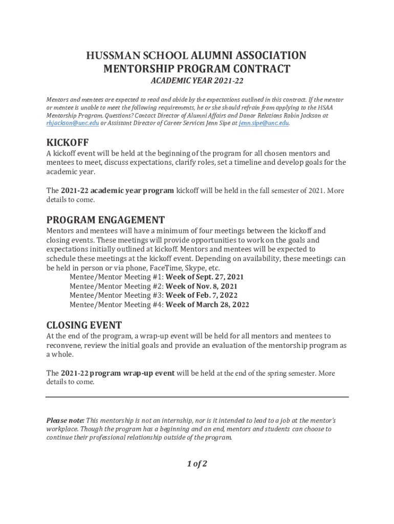 HUMAN SCHOOL ALUMNI ASSOCIATION MENTORSHIP PROGRAM CONTRACT ACADEMIC YEAR 202122 Mentors and mentees are expected to read and abide by the expectations outlined in this contract. If the mentor or