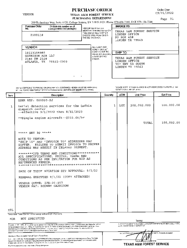 PURCHASE Recorder DateVENDORTEXAS A&M FOREST SERVICE PURCHASING DEPART ME\” IT 200 Technology Way, Suite 1120. College Station, TX 778453424; Phone 9794587380 FAX 9794.,S7386Purchase Order No.1