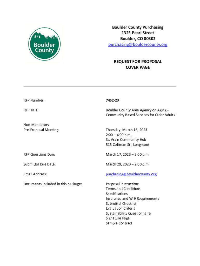Boulder County Purchasing 1325 Pearl Street Boulder, CO 80302 purchasing@bouldercounty.org REQUEST FOR PROPOSAL COVER PAGE RFP Number:745223RFP Title:Boulder County Area Agency on Aging Community