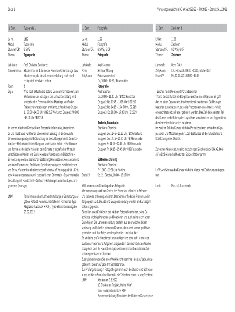 Sate: 11. SEM. Vorlesungsverzeichnis KD Wise 2021/22 PO 2019 Stand: 24.11.2021Typografie 11. SEM. Fotografie1. SEM. Aachen 1LV NR.:1112
