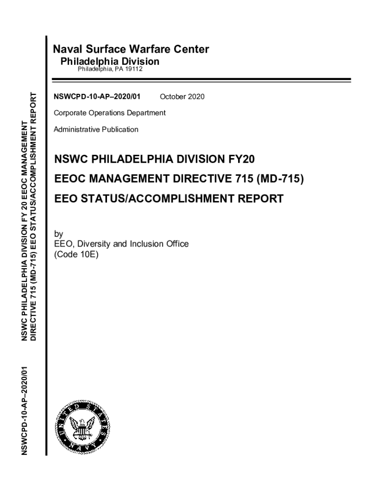 Naval Surface Warfare Center Philadelphia DivisionNSWCPD10AP2020/01NSWC PHILADELPHIA DIVISION FY 20 EEOC MANAGEMENT DIRECTIVE 715 (MD715) EEO STATUS/ACCOMPLISHMENT REPORT Philadelphia, PA 19112NSWCPD10AP2020/01October