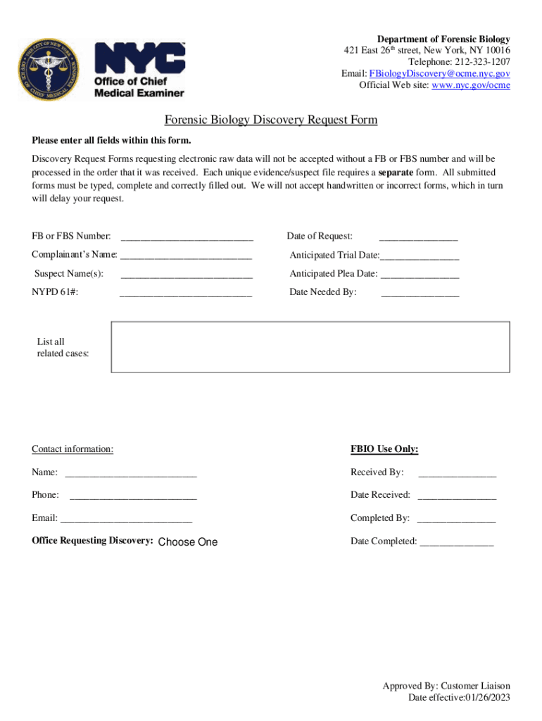 Department of Forensic Biology 421 East 26th street, New York, NY 10016 Telephone: 2123231207 Email: FBiologyDiscovery@ocme.nyc.gov Official Website: www.nyc.gov/ocmeForensic Biology Discovery Request