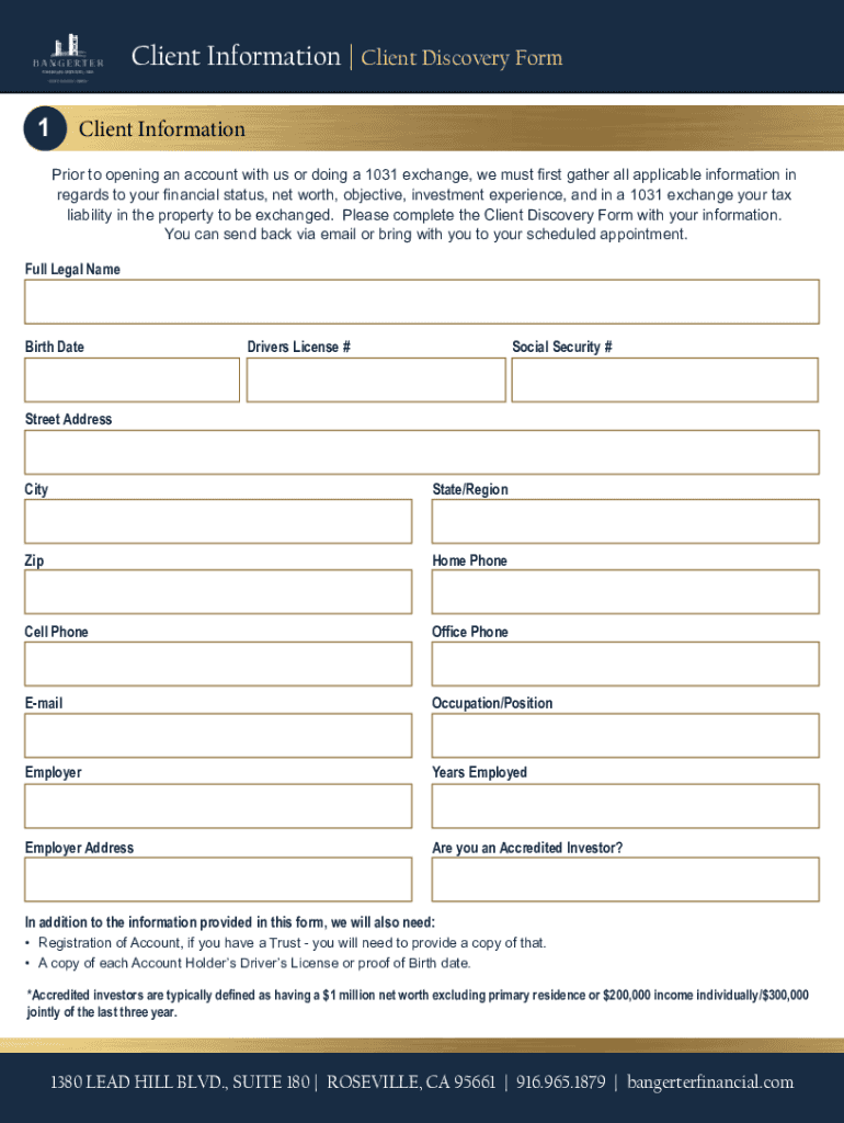 Client discovery form is a document used to collect information about a client's needs, goals, and preferences.