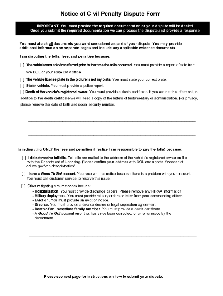 Get the free Notice of Civil Penalty Dispute Form - wsdot wa