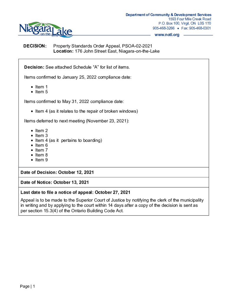 Department of Community & Development Services 1593 Four Mile Creek Road P.O. Box 100, Virgil, ON L0S 1T0 9054683266 Fax: 9054680301www.not.decision:Property Standards Order Appeal, PSOA022021 Location: