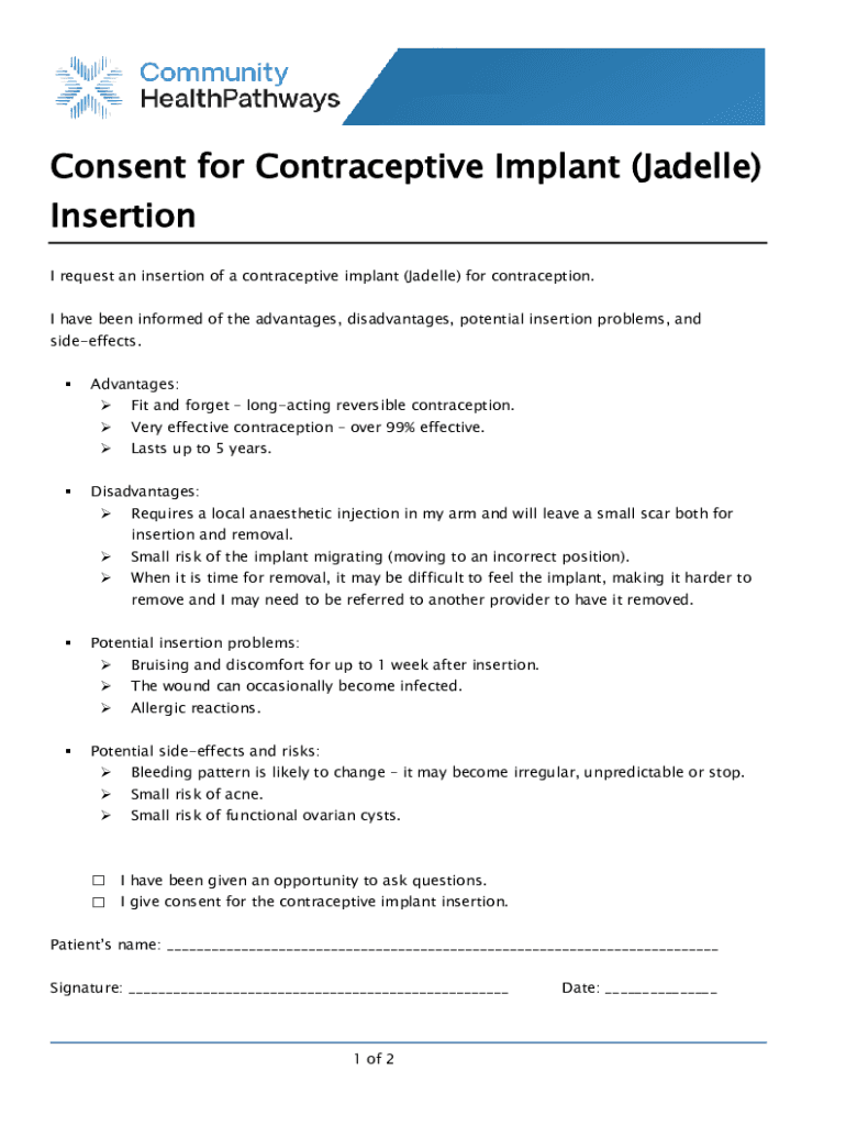 Consent for Contraceptive Implant (Jadelle) Insertion I request an insertion of a contraceptive implant (Jadelle) for contraception. I have been informed of the advantages, disadvantages, potential