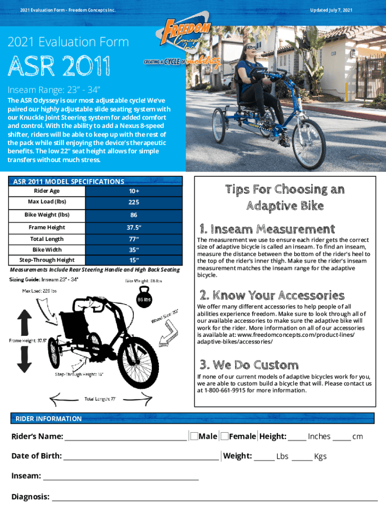 2021 Evaluation Form Freedom Concepts Inc. Updated July 7, 20212021 Evaluation Form ASR 2011 Inseam Range: 23 34The ASR Odyssey is our most adjustable cycle! We've paired our highly adjustable slide