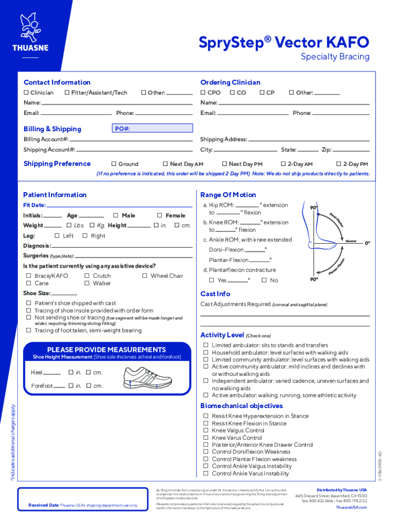 System Vector KAFOSpecialty BracingContact Information Clinician Fitter/Assistant/Tech Other:Name:Ordering Clinician CPO CO CP Other:Name:Email:Phone:Billing & ShippingEmail:Phone:PO#:Billing Account#:Shipping