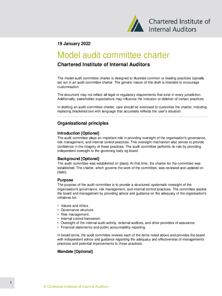 19 January 2022Model audit committee charter Chartered Institute of Internal Auditors The model audit committee charter is designed to illustrate common or leading practices typically set out in an