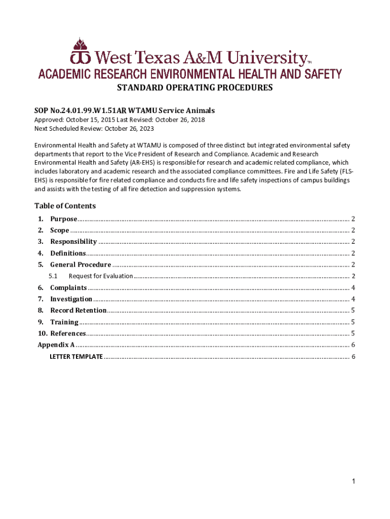 STANDARD OPERATING PROCEDURES SOP No.24.01.99. W1.51AR WT AMU Service Animals Approved: October 15, 2015, Last Revised: October 26, 2018, Next Scheduled Review: October 26, 2023Environmental Health