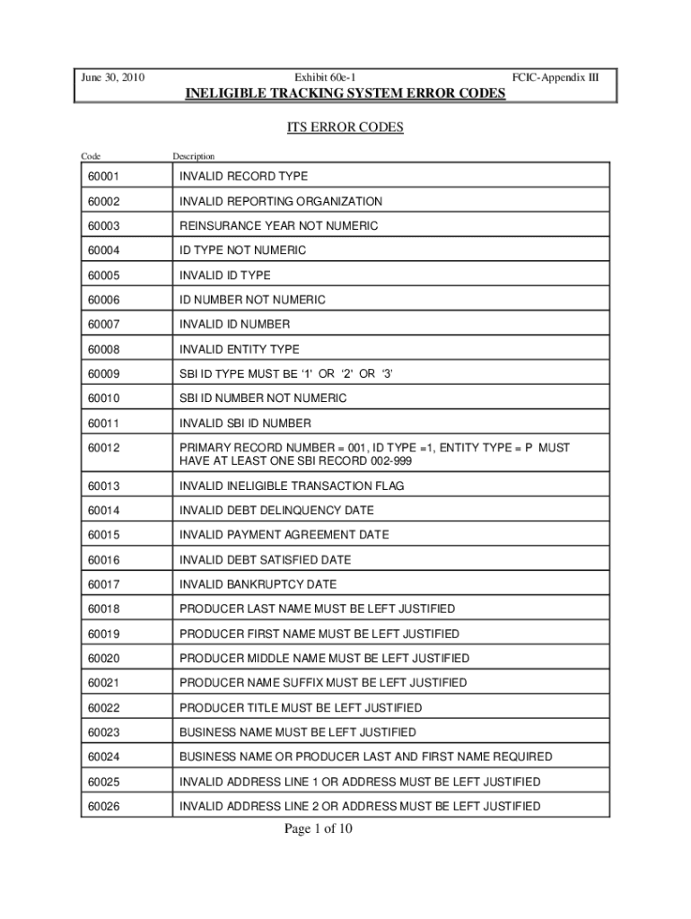 June 30, 2010Exhibit 60e1FCICAppendix INELIGIBLE TRACKING SYSTEM ERROR CODES ITS ERROR CODES CodeDescription60001INVALID RECORD TYPE60002INVALID REPORTING ORGANIZATION60003REINSURANCE YEAR NOT NUMERIC60004ID