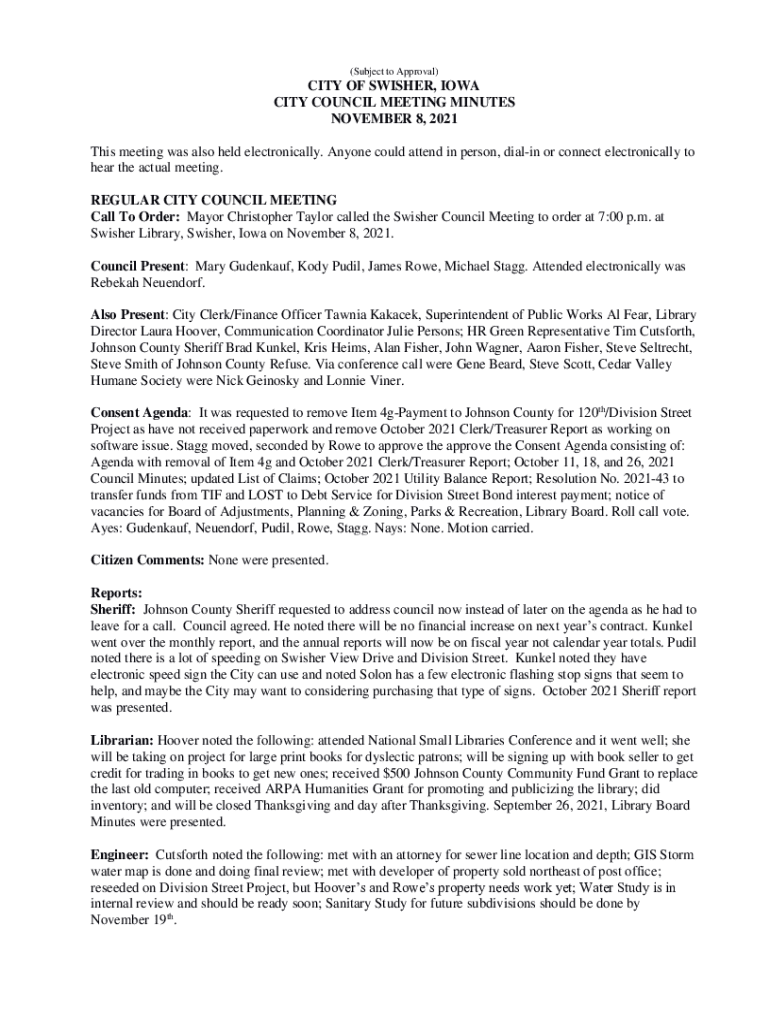 (Subject to Approval)CITY OF SWISHER, IOWA CITY COUNCIL MEETING MINUTES NOVEMBER 8, 2021, This meeting was also held electronically. Anyone could attend in person, dialing or connect electronically