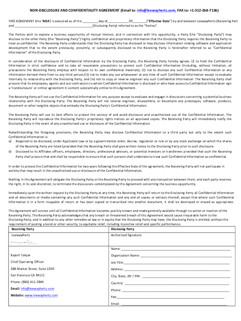 DISAGREEMENT(the\'NDA\')isexecutedasofthis___dayof___20___(EffectiveDate)byandbetweenLeewayHertz(ReceivingParty);