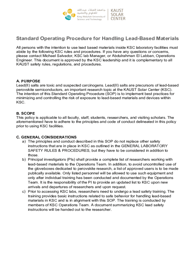 Standard Operating Procedure for Handling Leased Materials All persons with the intention to use lead based materials inside KSC laboratory facilities must abide by the following KSC rules and procedures.