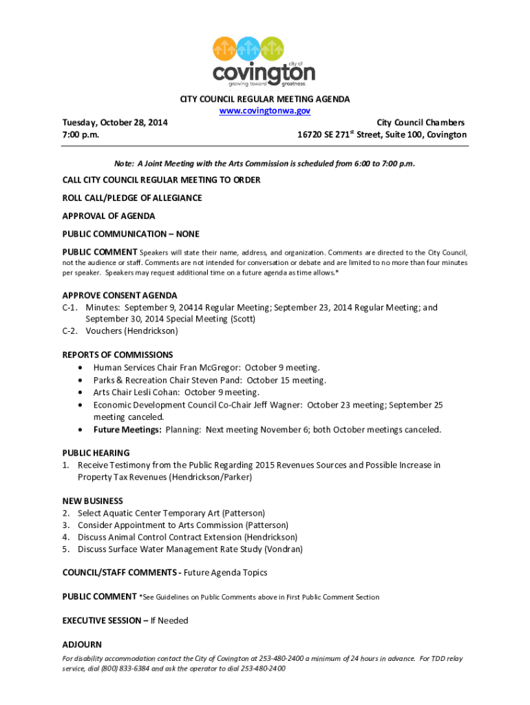 Tuesday, October 28, 2014 7:00 p.m.CITY OF COVINGTON CITY COUNCIL REGULAR MEETING AGENDA www.covingtonwa.govCity Council Chambers 16720 SE 271st Street, Suite 100, CovingtonNote: A Joint Meeting with