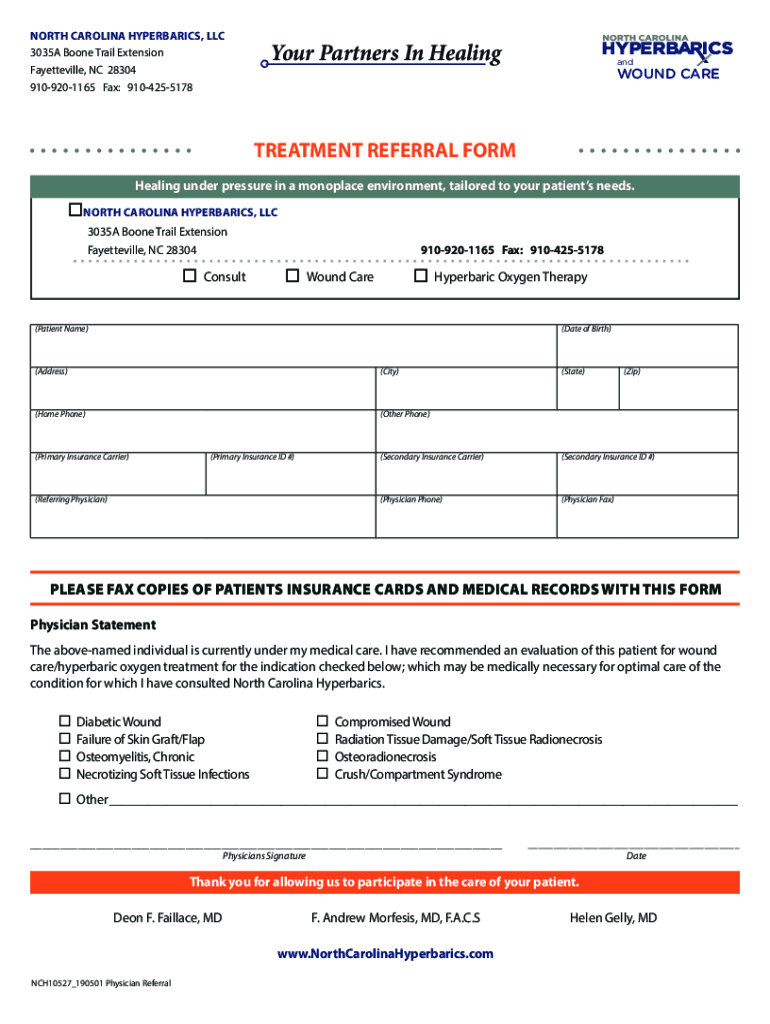 Fayetteville, NC 28304Your Partners In HealingandWOUND CARE9109201165 Fax: 9104255178TREATMENT REFERRAL FORM