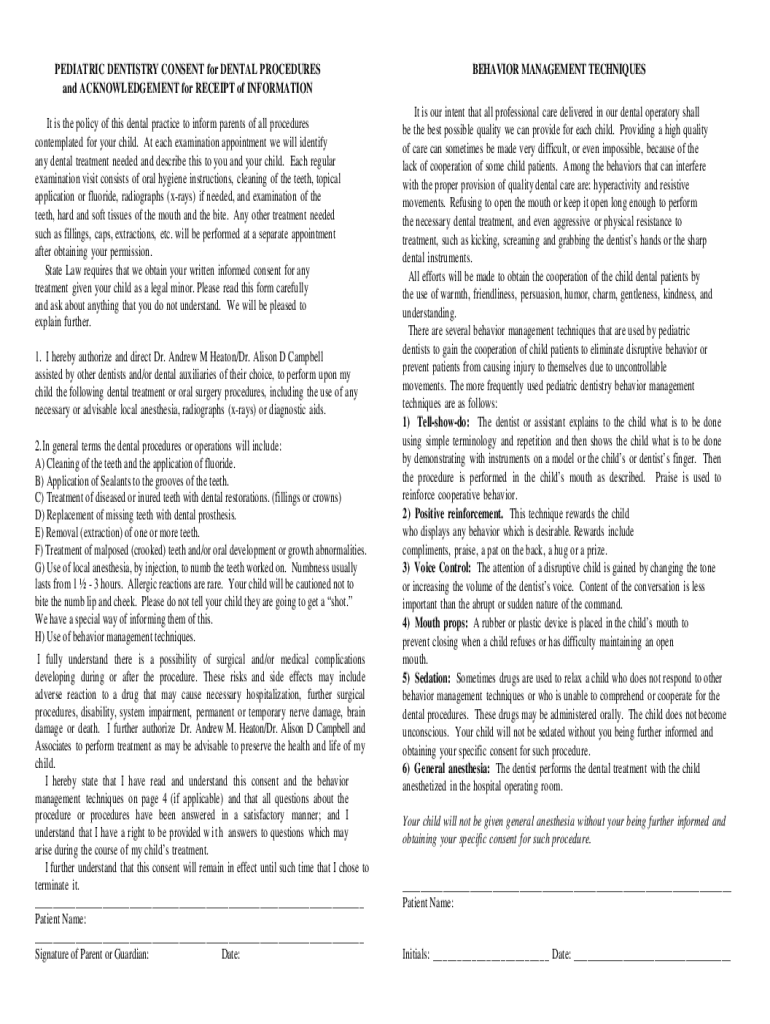 PEDIATRIC DENTISTRY CONSENT for DENTAL PROCEDURES and ACKNOWLEDGEMENT for RECEIPT of INFORMATION It is the policy of this dental practice to inform parents of all procedures contemplated for your