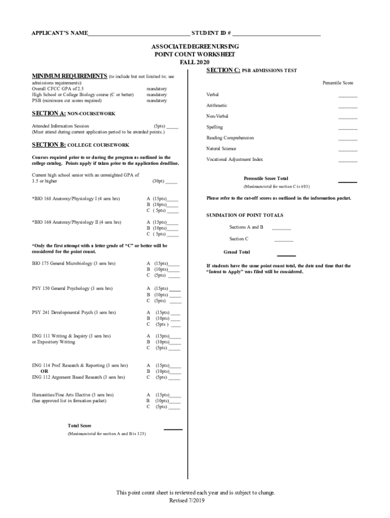 APPLICANTS NAME___ S STUDENT ID # ___ASSOCIATE DEGREE NURSING POINT COUNT WORKSHEET FALL 2020 SECTION C: PSB ADMISSIONS TESTMINIMUM REQUIREMENTS (to include but not limited to; see admissions requirements):