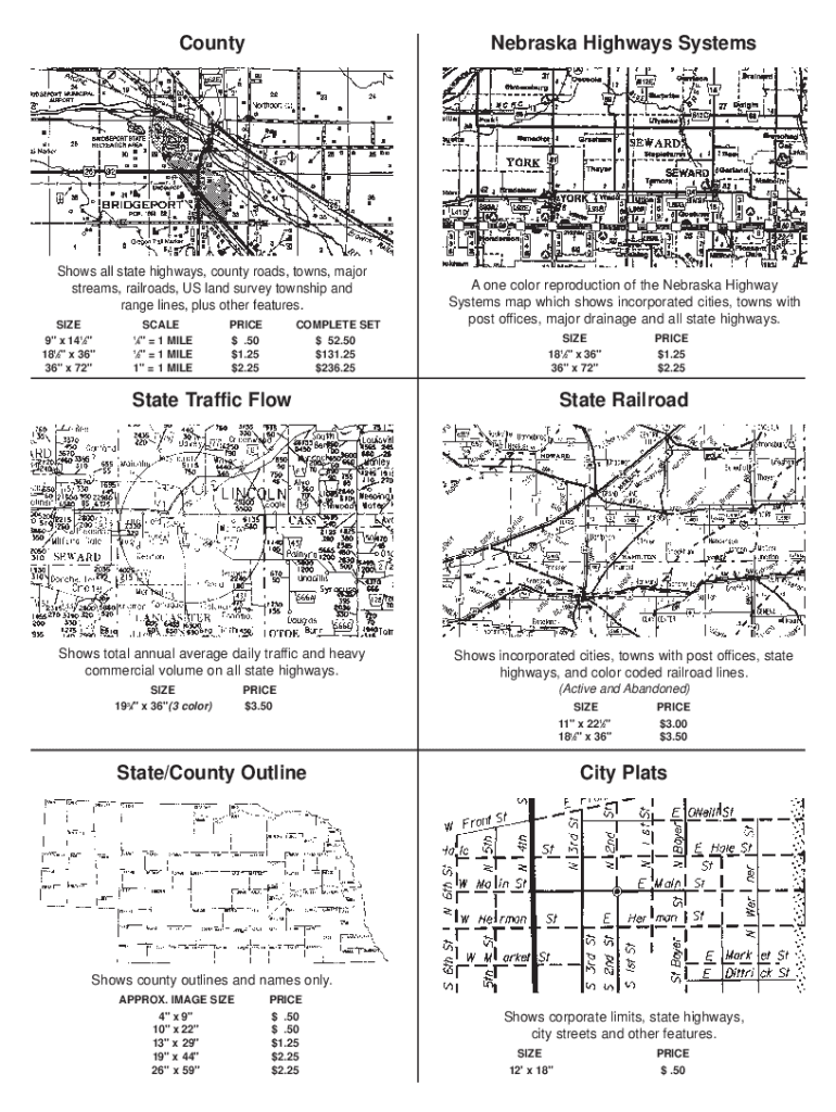 County Nebraska Highways SystemsShows all state highways, county roads, towns, major streams, railroads, US land survey township and range lines, plus other features. SIZE 9\” x 1412\” 1812\”