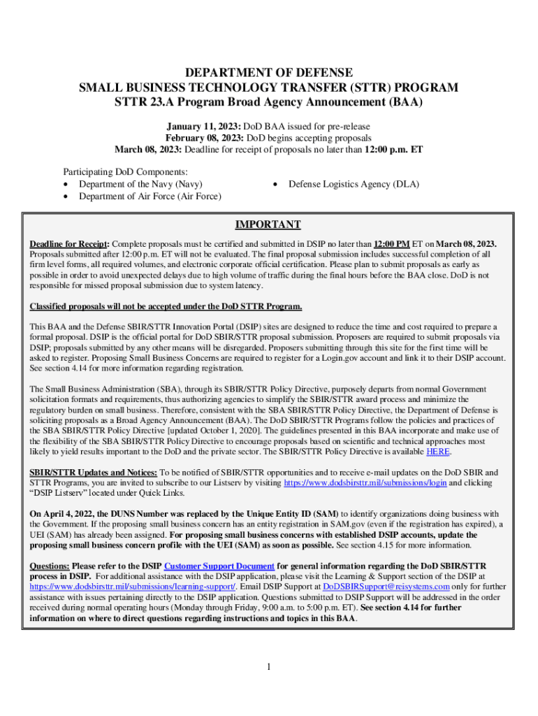 DEPARTMENT OF DEFENSE SMALL BUSINESS TECHNOLOGY TRANSFER (STAR) PROGRAM STAR 23. A Program Broad Agency Announcement (BAA) January 11, 2023: DoD BAA issued for prerelease February 08, 2023: DoD begins