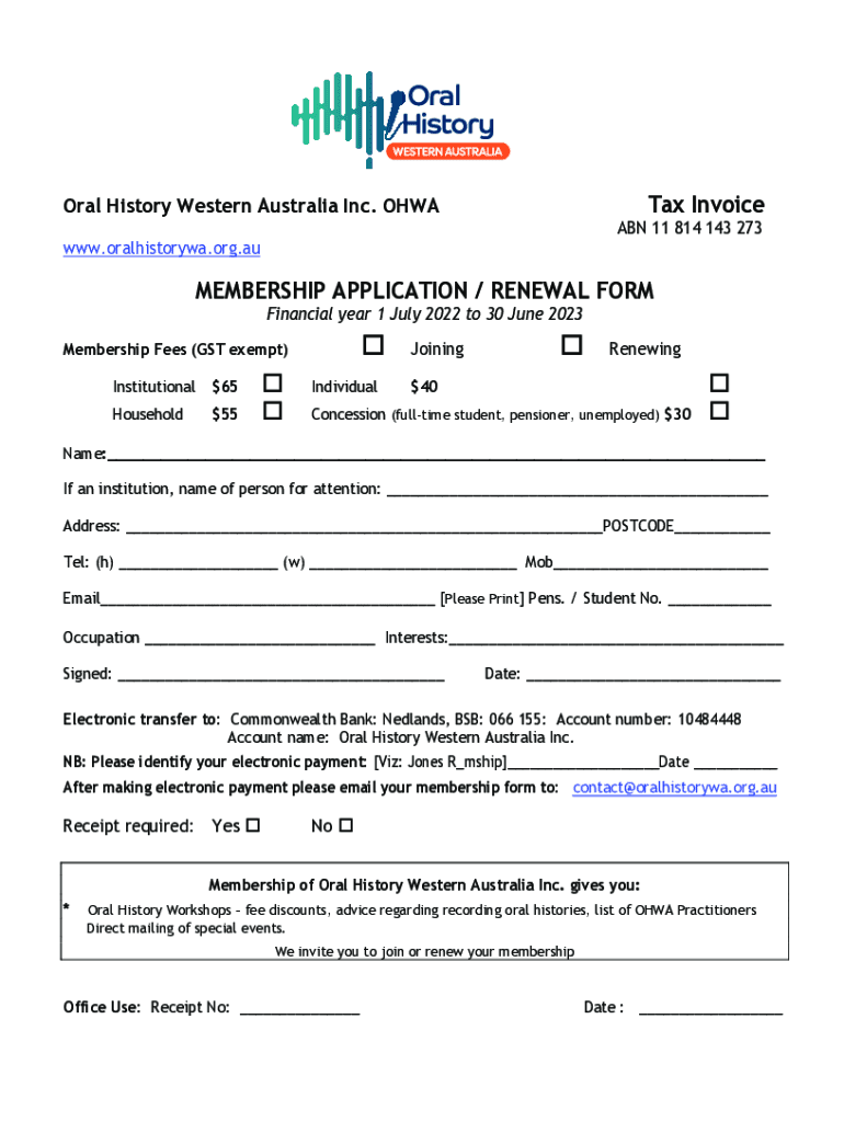 Tax InvoiceOral History Western Australia Inc. OHIOAN 11 814 143 273www.oralhistorywa.org.membership APPLICATION / RENEWAL FORM Financial year 1 July 2022 to 30 June 2023oMembership Fees (GST exempt)