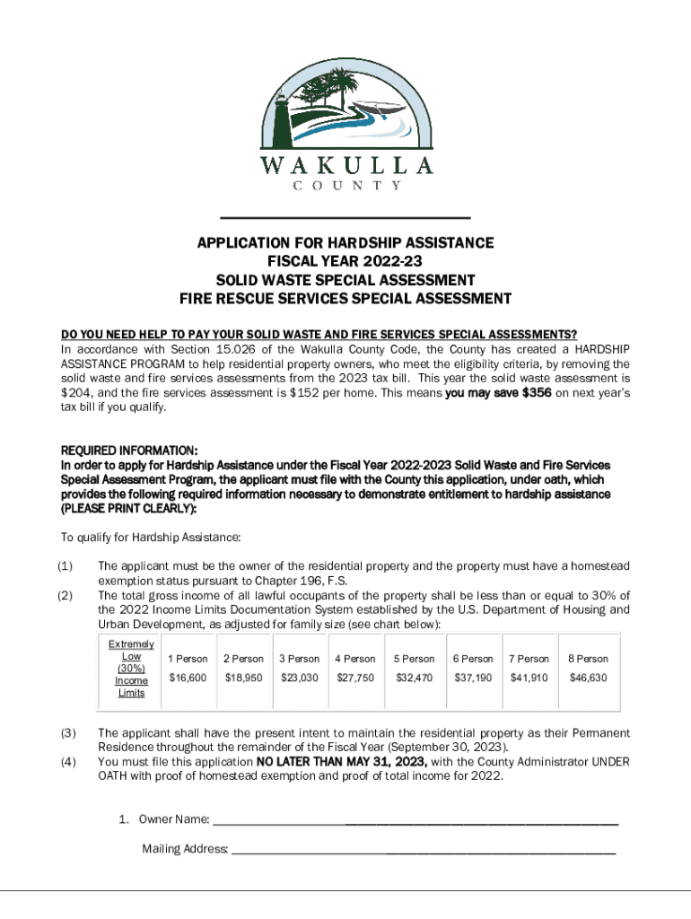 APPLICATION FOR HARDSHIP ASSISTANCE FISCAL YEAR 202223 SOLID WASTE SPECIAL ASSESSMENT FIRE RESCUE SERVICES SPECIAL ASSESSMENT DO YOU NEED HELP TO PAY YOUR SOLID WASTE AND FIRE SERVICES SPECIAL ASSESSMENTS?