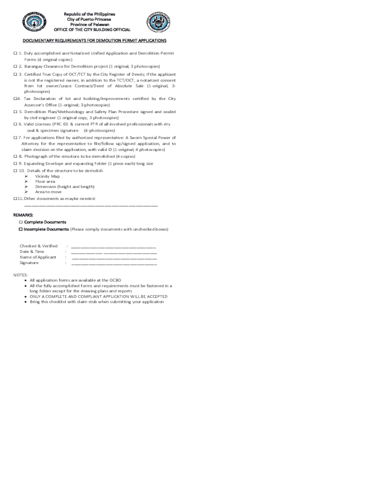 Republic of the Philippines City of Puerto Princes Province of Malayan OFFICE OF THE CITY BUILDING OFFICIAL DOCUMENTARY REQUIREMENTS FOR DEMOLITION PERMIT APPLICATIONS 1. Duly accomplished and Notarized