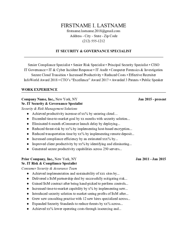 FILENAME I. HOSTNAME firstname.lastname.2018@gmail.com Address City State Zip Code (212) 5551212 IT SECURITY & GOVERNANCE SPECIALIST ___ Senior Compliance Specialist Senior Risk Specialist Principal