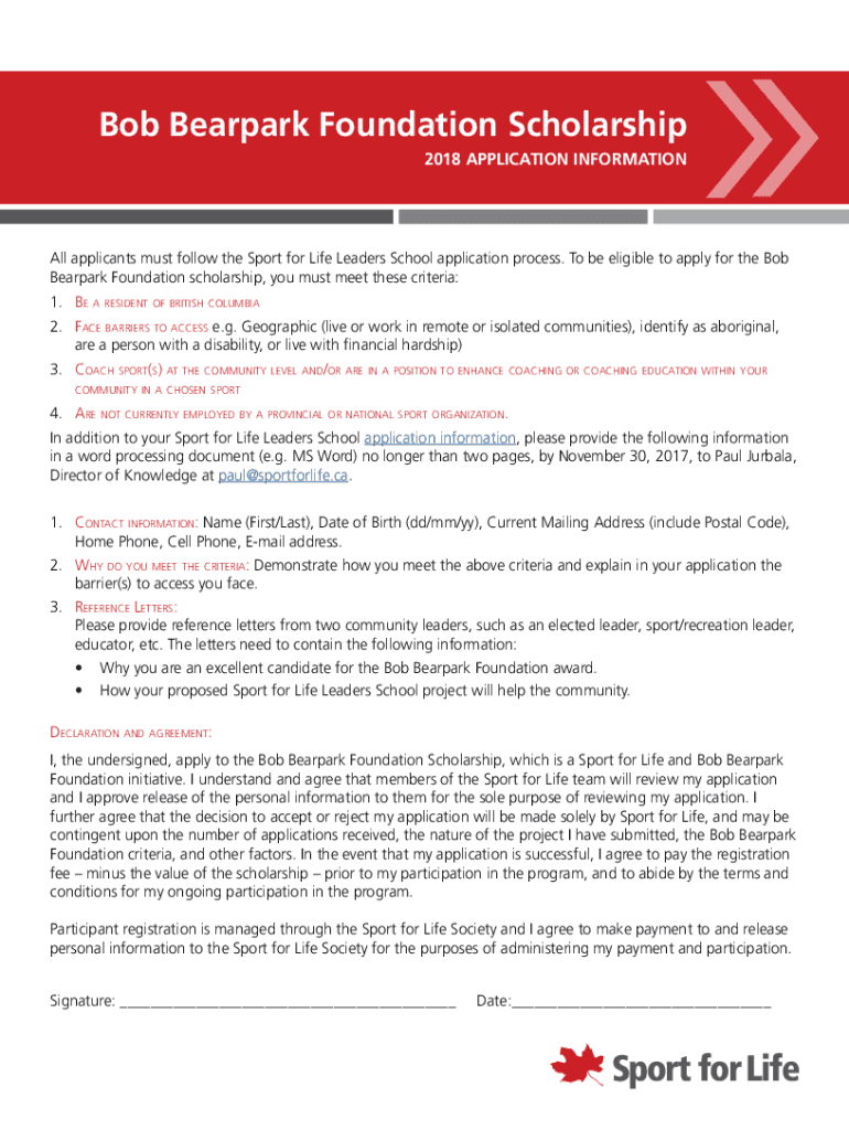 Bob Bear park Foundation Scholarship 2018 APPLICATION Informational applicants must follow the Sport for Life Leaders School application process. To be eligible to apply for the Bob Bear park Foundation