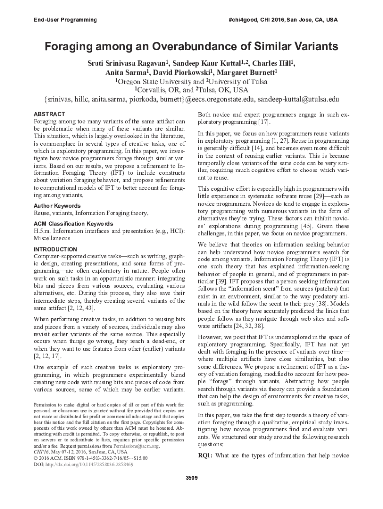 Endured Programming#chi4good, CHI 2016, San Jose, CA, Foraging among an Overabundance of Similar Variants South Srinivasan Ragavan1, Sandeep AUR Kuttal1,2, Charles Hill1, Anita Sarma1, David Piorkowski1,
