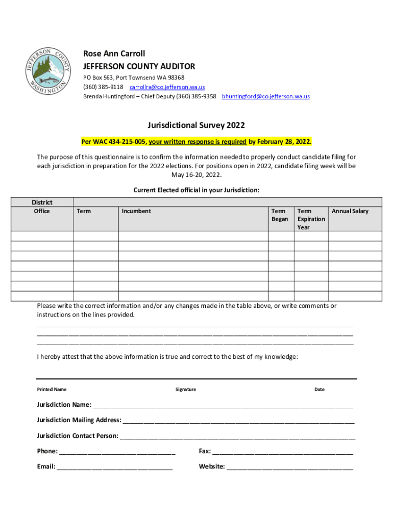 Rose Ann Carroll JEFFERSON COUNTY AUDITOR PO Box 563, Port Townsend WA 98368 (360) 3859118 carrollra@co.jefferson.wa.us Brenda Hunting ford Chief Deputy (360) 3859358 bhuntingford@co.jefferson.wa.usJurisdictional