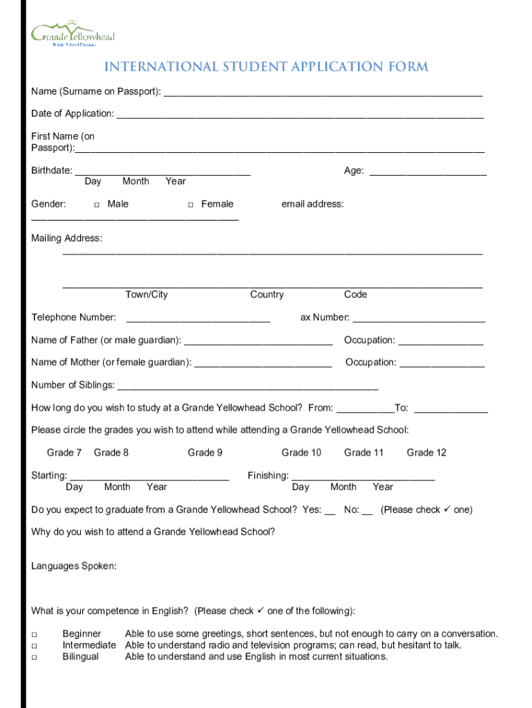 INTERNATIONAL STUDENT APPLICATION FORM Name (Surname on Passport): ___ Date of Application: ___ First Name (on Passport):___ Birthdate: ___ Day Month Year Gender: Male Female ___Age: ___ email address:Mailing