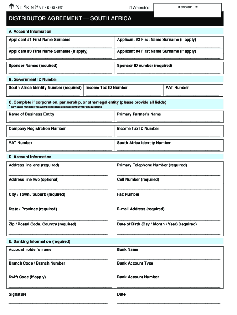 AmendedDistributor ID#DISTRIBUTOR AGREEMENT SOUTH AFRICA A. Account Information Applicant #1 First Name Surname ___Applicant #2 First Name Surname (if apply) ___Applicant #3 First Name Surname (if