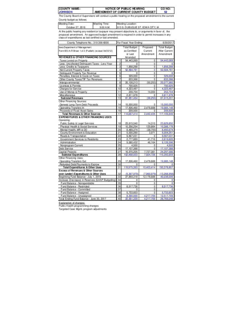 COUNTY NAME: JOHNSONNOTICE OF PUBLIC HEARING AMENDMENT OF CURRENT COUNTY BUDGE TCO NO: 52The County Board of Supervisors will conduct a public hearing on the proposed amendment to the current County