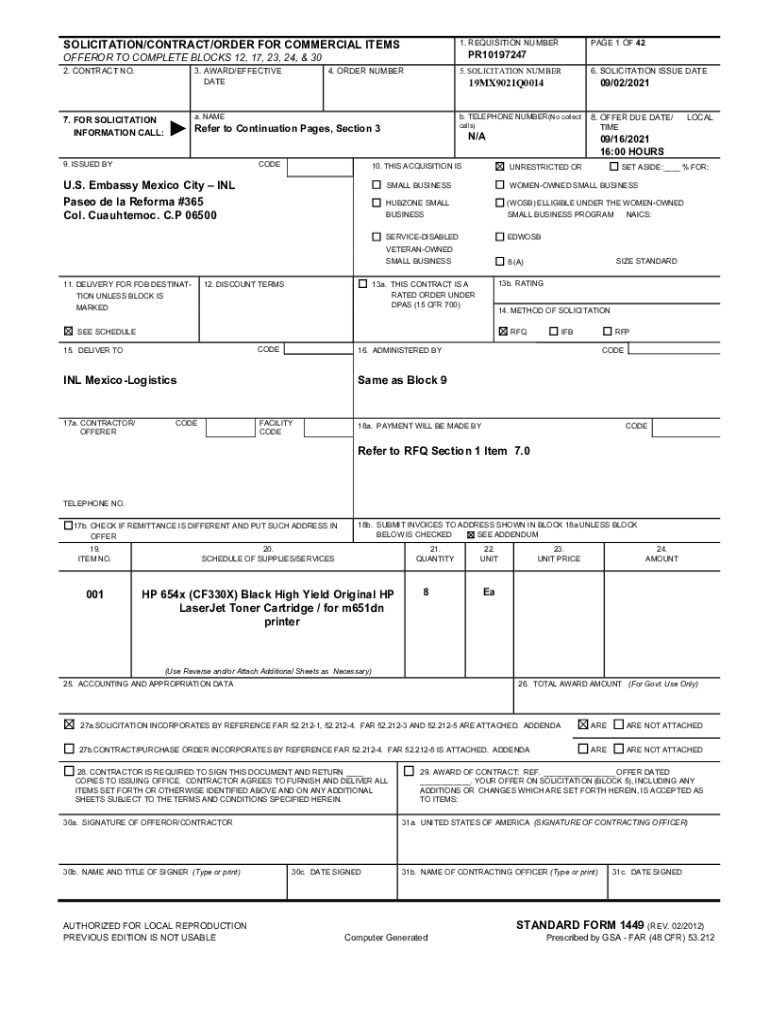 SOLICITATION/CONTRACT/ORDER FOR COMMERCIAL ITEMS1. REQUISITION NUMBER2. CONTRACT NO.3. AWARD/EFFECTIVE DATE7. FOR SOLICITATION INFORMATION CALL:4. ORDER NUMBER6. SOLICITATION ISSUE DATE5. SOLICITATION