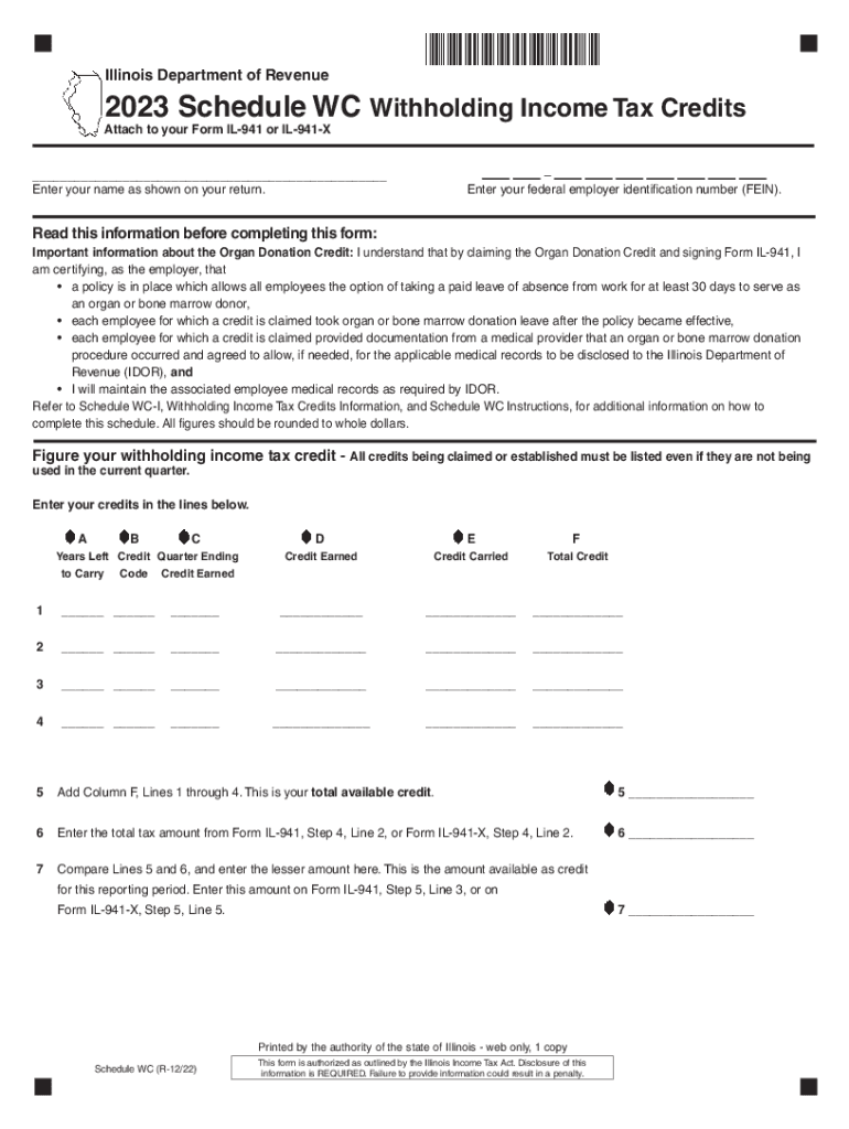 Use your mouse or Tab key to move through the fields. Use your mouse or space bar to enable check boxes. Illinois Department of Revenue×72112231W×2023 Schedule WC Withholding Income Tax CreditsAttach
