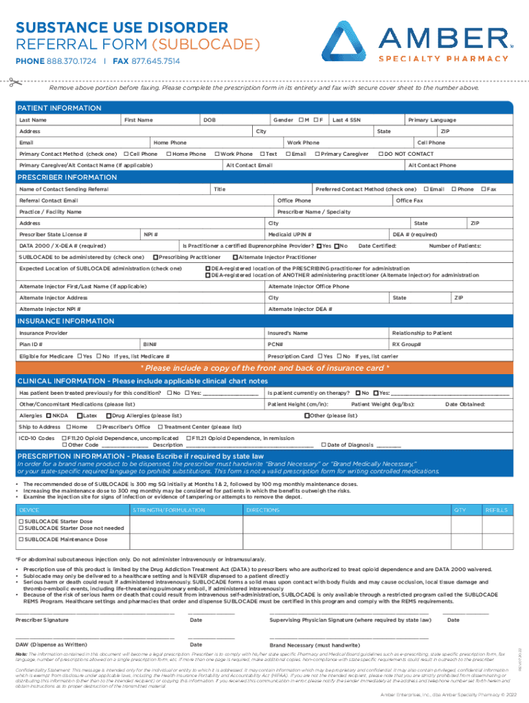 SUBSTANCE USE DISORDER REFERRAL FORM (BLOCKADE) PHONE 888.370.1724 I FAX 877.645.7514 Remove above portion before faxing. Please complete the prescription form in its entirety and fax with secure